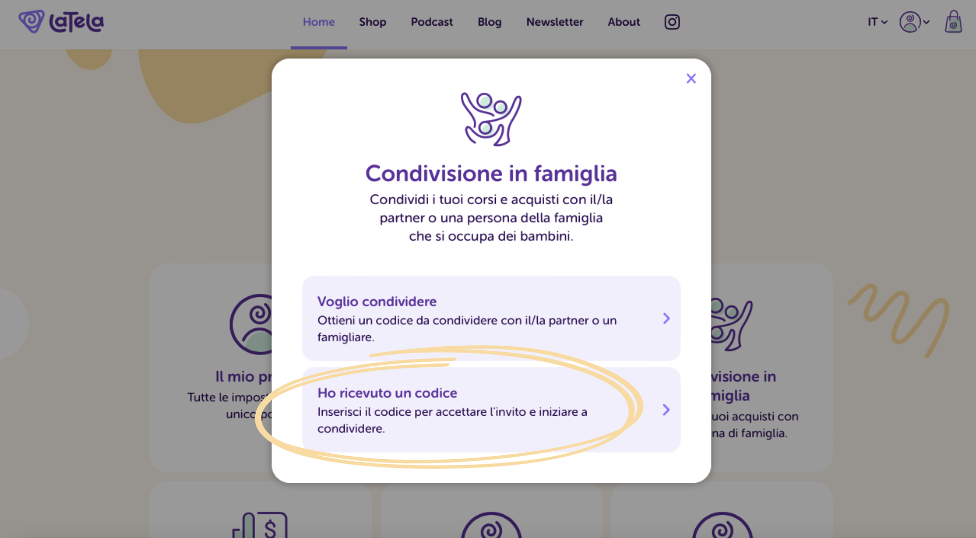 - Vai su: account - condivisione in famiglia - ho ricevuto un codice